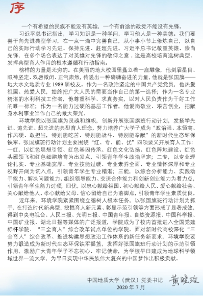 党委紧紧围绕立德树人根本任务,创新开展“张国旗班”行动计划,发扬学先进、追先进、超先进的典型育人理念,以政治坚定为出发点、以专业精湛为切入点、以能力过硬为着力点、以素质优良为落脚点,致力培养广大学子成为“政治强、本领高、作风硬、敢担当,特别能吃苦、特别能战斗、特别能奉献”的新时代生态环保铁军,打造时代新典型,挖掘育人新元素,要努力锻造成为新时代生态环保铁军摇篮,激励广大青年学子不忘初心、牢记使命,为学校早日建成为地球科学领域世界一流大学,为早日实现中华民族伟大复兴的中国梦作出积极贡献。