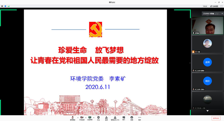 他围绕生命至上、生命教育、做大爱之人、做合格党员四部分讲授。他说,世间万物,人是最宝贵的。习近平总书记强调,“把人民群众生命安全和身体健康放在第一位,把疫情防控工作作为当前最重要的工作来抓,不遗漏一个感染者,不放弃每一位病患”,这是人民至上、生命至上的真实内涵,同学们一定要深刻学习领会。此次抗击疫情是善待生命、生命至上的试金石,一定要践行人与自然和谐共生理念,善待自己和他人,珍爱每一个生命。在谈到生命教育时,他强调生命的价值与意义,不仅仅在于存在,要与生活、生产相结合,把个人生命放在群体中、放在自然界中,把个人的生命价值,放在历史演进过程和中国梦伟大进程中。特别是作为党员,一定要把有限的生命投入到无限的为人民服务中去。在生生不息的家庭家族、国家民族的历史进程中、跑好接力棒。