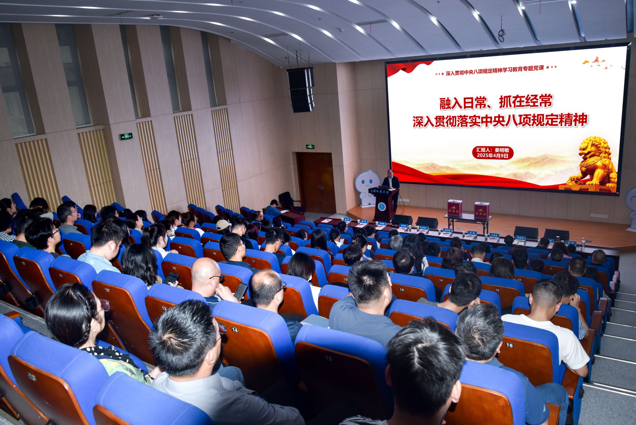 关于开展深入贯彻中央八项规定精神学习教育的工作安排,4月9日下午,学院党委书记姜明敏以“融入日常、抓在经常,深入贯彻落实中央八项规定精神”为题讲授专题党课。本次党课在科教楼四108报告厅举行,学院党政领导班子成员、全体教职工党员和学生党员代表参加。