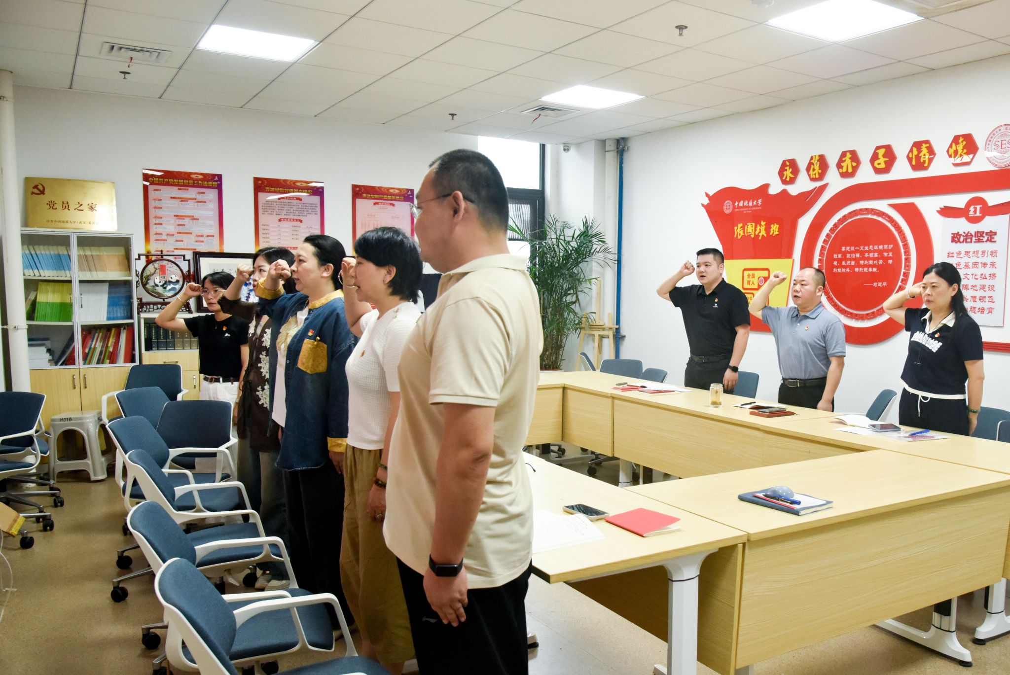 支部党员唱国歌、温誓词。