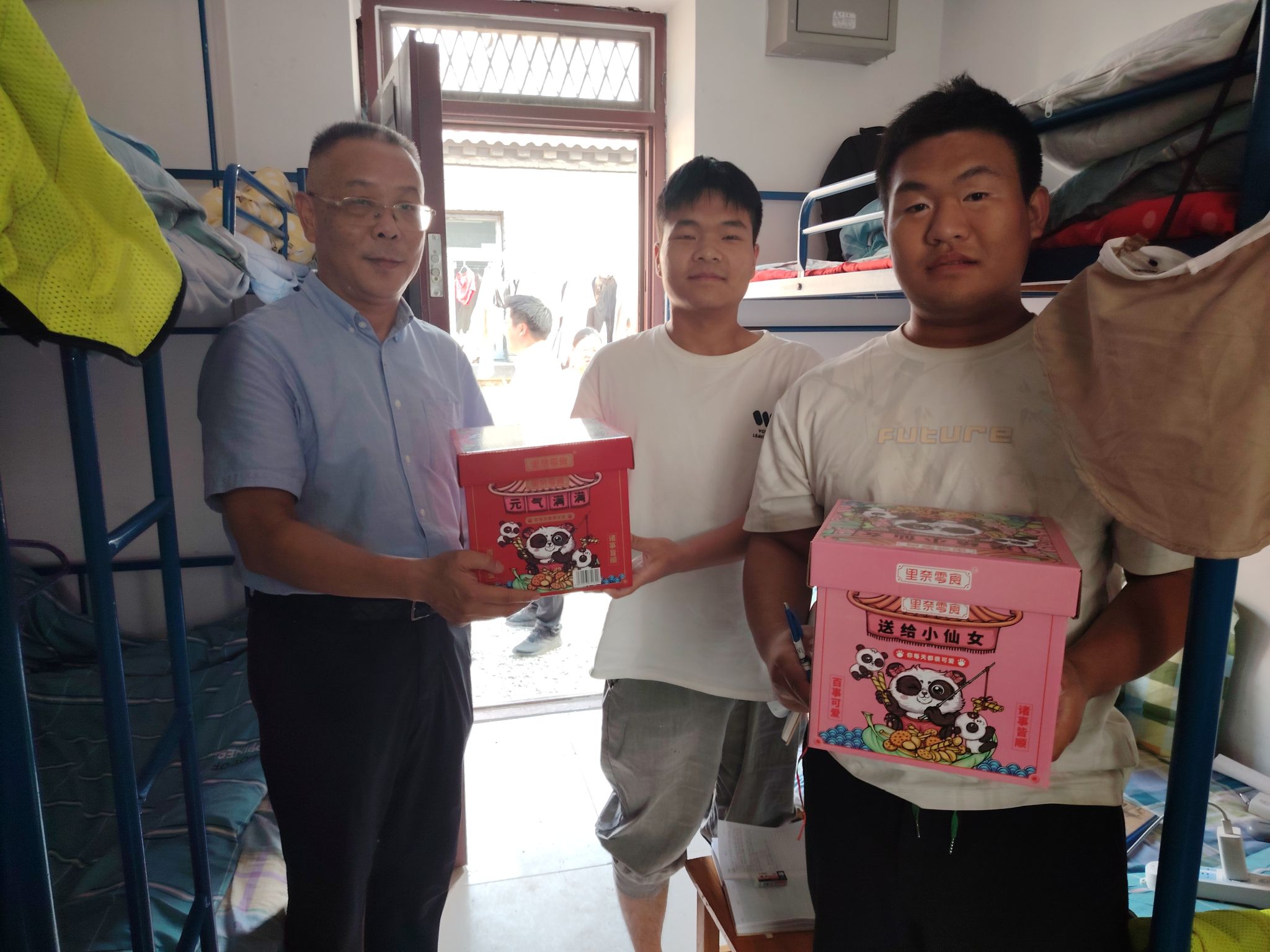 唐忠阳一行前往宿舍看望实习学生,与同学们亲切交谈,关心了解同学们实习生活情况,交流实习体会,提醒同学们一定要注意人身安全,并为师生送上慰问品。