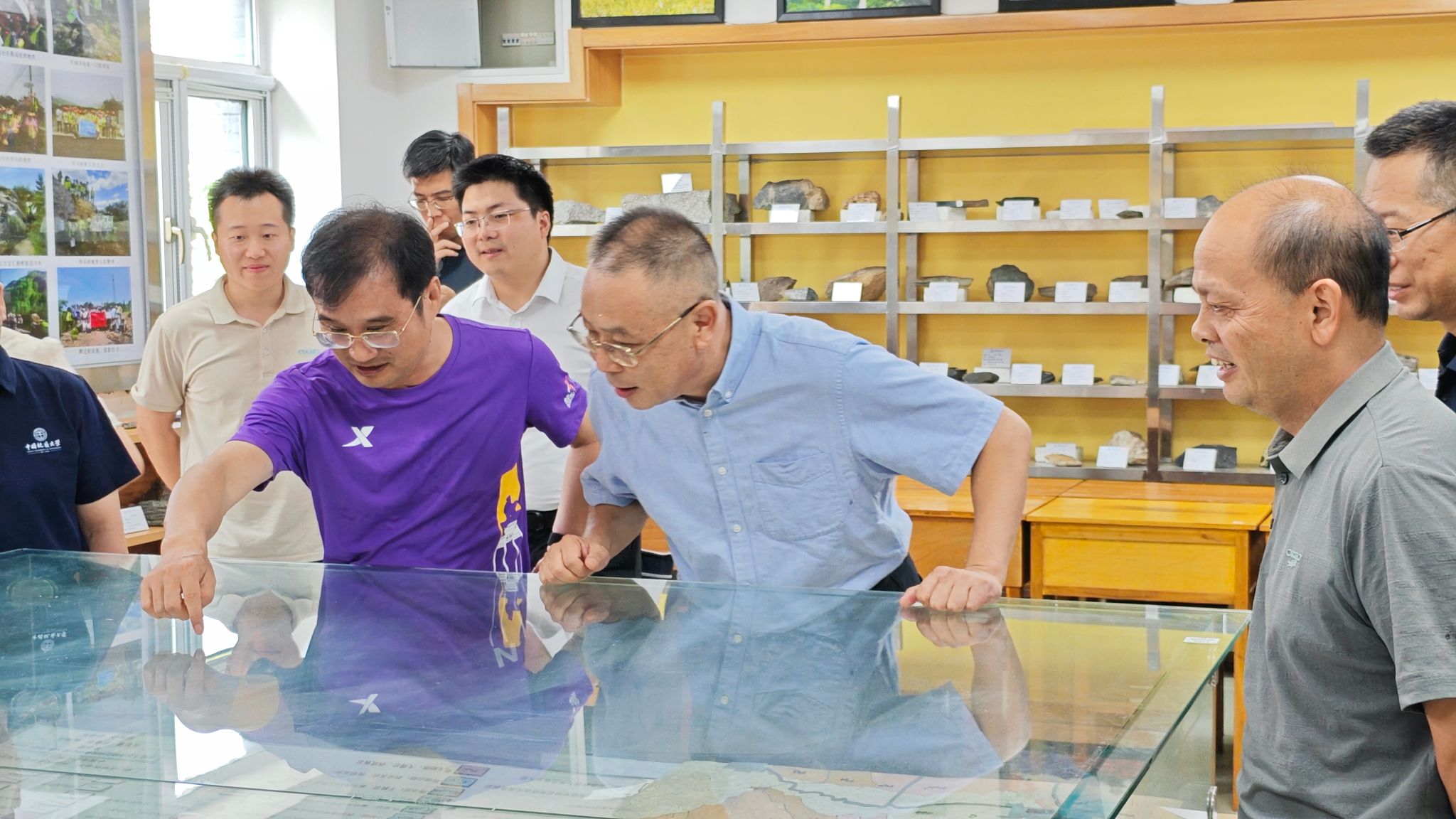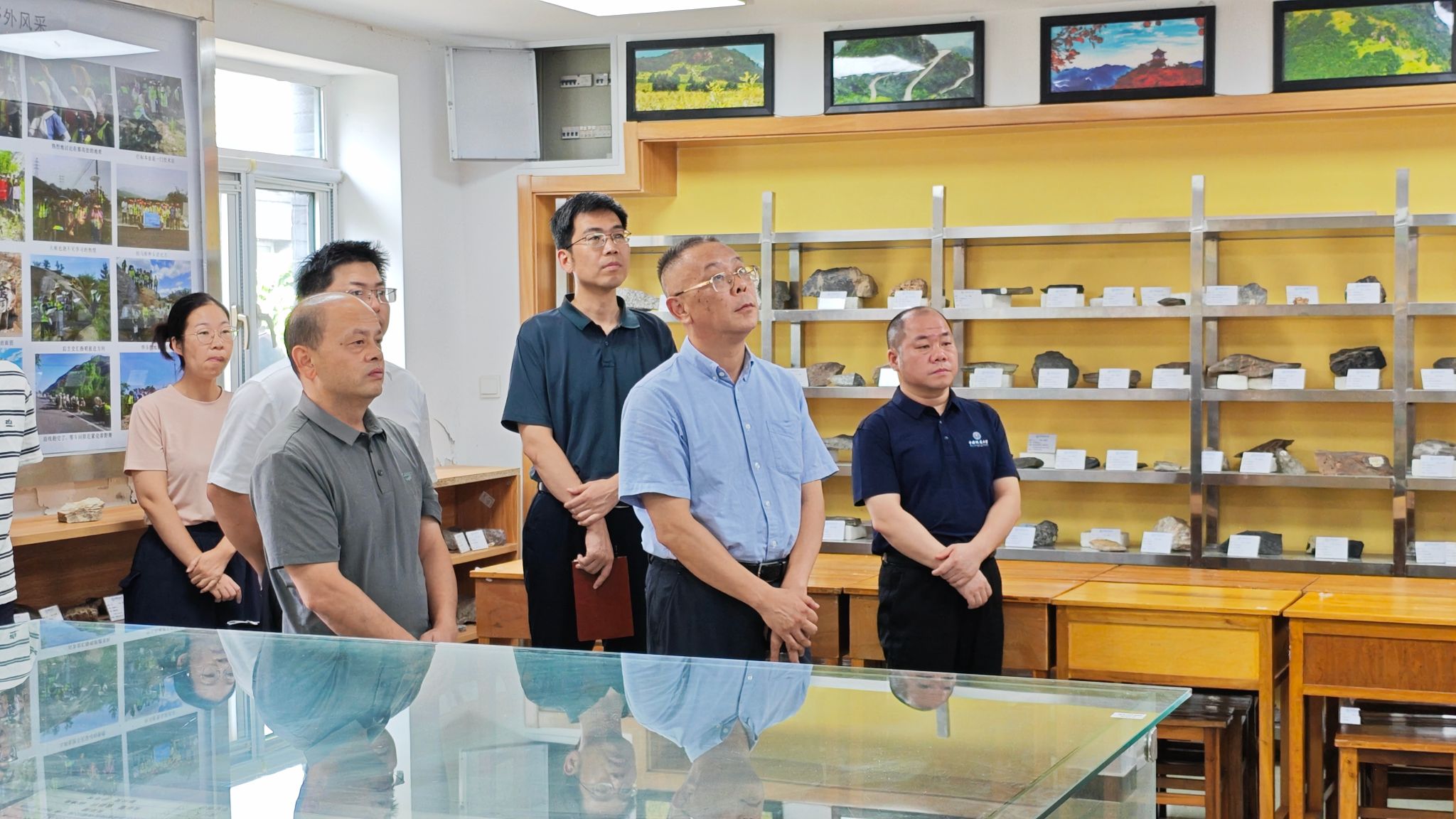 唐忠阳一行参观实习站标本室,观看周口店实习站70周年站庆纪念视频。环境科学与工程系副教授罗朝晖现场介绍周口店实习区的地质概况。