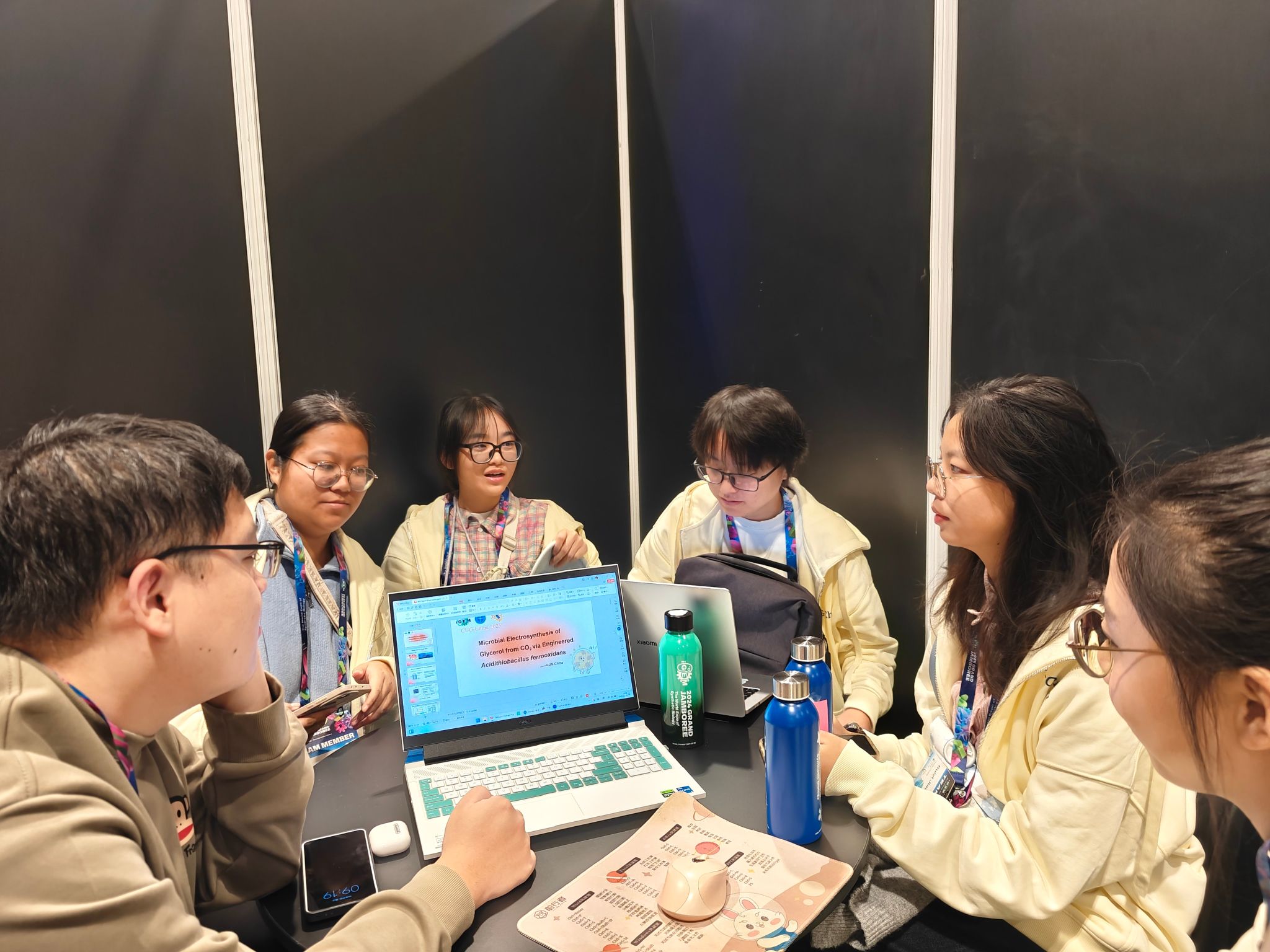 、地球物理与空间信息学院、艺术与传媒学院和经济管理学院等4个学院的16名本科生组成,由石良教授带领的地质微生物研究团队(包括董依然教授、蒋永光副教授、胡译丹副教授和姜舟副教授)担任指导教师,胡译丹副教授主要指导。经过一年的努力,团队完成了“固碳转甘油”的创新研究,涵盖项目策划、实验设计、数据分析及现场展示等多个环节。该研究通过合成生物学的方法改造嗜酸性氧化亚铁硫杆菌(Acidithiobacillus ferrooxidans),以构建电合成体系,实现二氧化碳的固定并转化为甘油,从而探索在清洁能源驱动下可持续碳循环的新路径。10月28日至31日,18小说