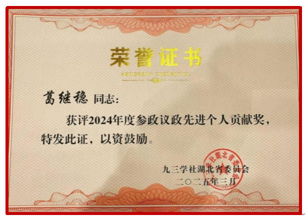 生物系葛继稳教授获评九三省委会“2024年度参政议政先进个人贡献奖”。