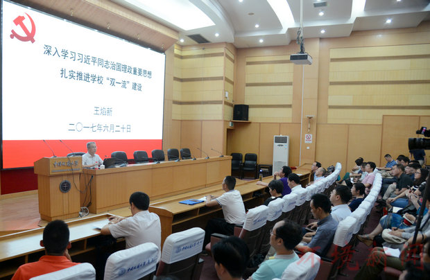 (通讯员:王碧 摄影:张学海)2017年6月20日晚,在迎宾楼报告厅,王焰新校长以《深入学习习近平同志治国理政重要思想,扎实推进学校“双一流”建设》为题讲授专题党课。