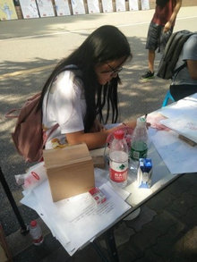 (左图为小组成员制作版面,右图为肖何竞同学为社区居民发放书签)