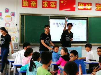 (左图志愿者为小学生发放小礼物,右图为志愿者和小学生合影)