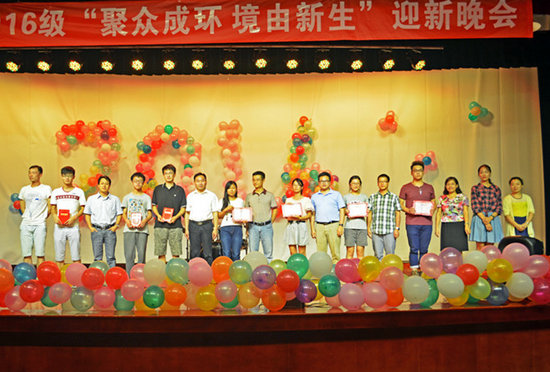 2016年“聚众成环,境由新生”迎新晚会暨第十三届环境文化科技节开幕式在西区大学生活动中心二楼隆重举行。学院党委书记李素矿,副院长甘义群、郭会荣,党委副书记朱继,各系室老师代表,以及学工组全体辅导员老师出席。黄奕名、焦聪、谭浩言、刘颖等四名同学共同主持了晚会。