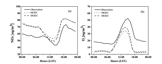 图2 江苏13个地市NO2和O3的模拟值与观测值日变化对比