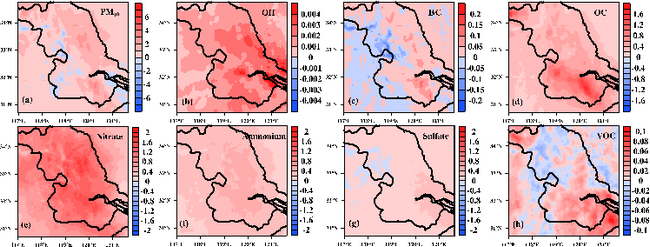 但PM2.5的模拟浓度在一次PM2.5排放降低的情况下不降反升,原因可能在于更新后的清单由于高的VOCs和CO以及低的NOx排放量,使得模拟的O3和OH自由基增多,大气氧化性增强,导致更多的SO2和NO2向硫酸盐和硝酸盐转化,间接抵消了电厂一次PM2.5的减排效果;同时当前电厂严格的SO2控制使得更多的NH3与NO2反应,导致模拟的硝酸盐增多更明显(图3)。这些结果也是这一研究的亮点。因此,在减排措施制定时,应充分考虑空气质量对大气污染物变化的非线性响应,实现科学减排。