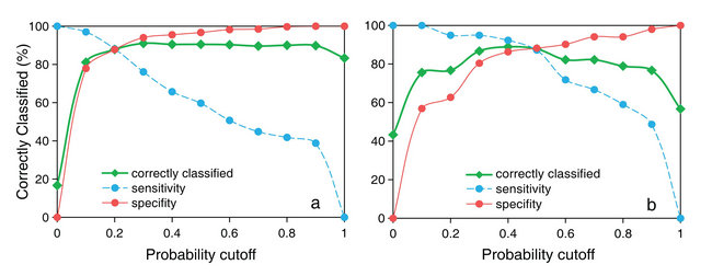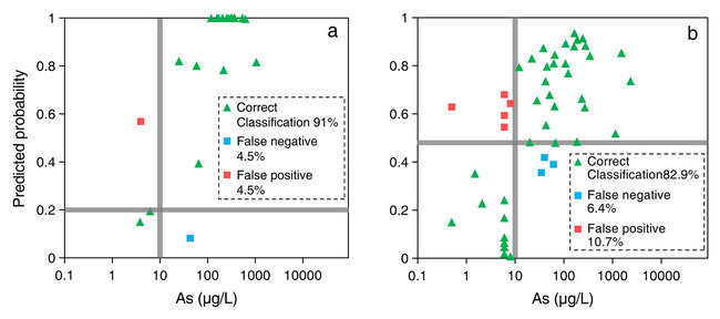 图2. 预测模型测试集分类结果(a,大同盆地,截断概率0.20;b,孟加拉,截断概率0.48)