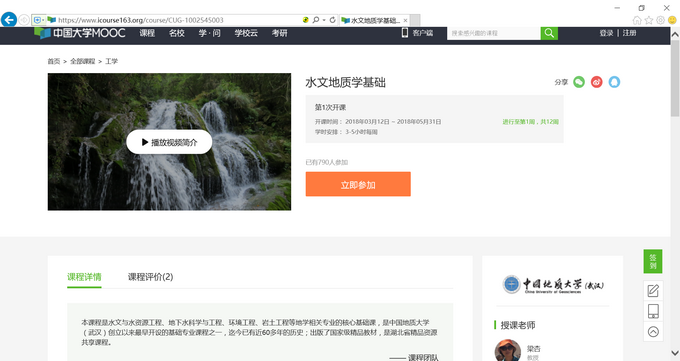 梁杏教授负责的《水文地质学基础》MOOC课程在中国大学MOOC(慕课)优质在线课程学习平台(www.icourse163.org)上线,这是18小说