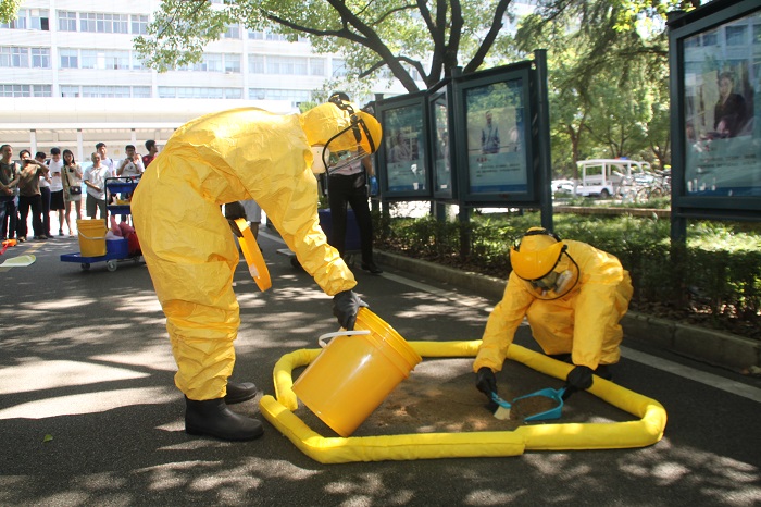 8名学生代表穿上密不透风的防护服、防毒面罩和护目镜全程参加演练。演练以实验室有机废液转运泄露事故为案例,模拟了实验员意外碰倒有机废液桶后,上报事故、现场封锁及事故危害评估、应急救援人员个人防护、消除危险源与现场恢复、事故发生后的报告、调查与评估等应急救援环节。
