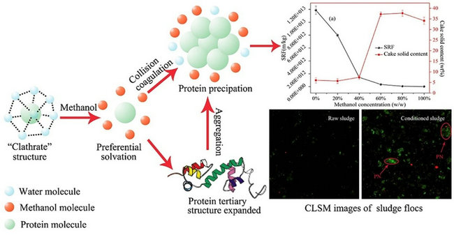 2.提出了甲醇和无机混凝剂耦合调理强化污泥脱水性能的新型技术,阐明了耦合调理过程中污泥类凝胶结构的演变行为,发现了甲醇通过破坏蛋白质的水化层和诱导凝聚实现污泥结合水的脱除。研究成果发表于Water Research。