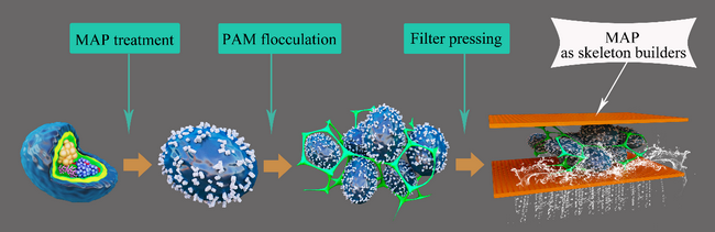 研究团队开发了两种基于骨架助滤和有机高分子絮凝的厌氧消化污泥强化脱水新技术,揭示了联合调理的作用机制。针对厌氧消化污泥高氨氮和高磷酸盐等特点,采用诱导原位结晶骨架助滤耦合高分子絮凝,将污泥强化脱水和营养回收相耦合,提升污水处理的可持续性。研究发现原位结晶形成的磷酸铵镁结晶(MAP)可以通过吸附 EPS 促使絮体的致密化,改善污泥的过滤行为。此外,研究组还提出基于污泥炭基材料(sludge based carbon,SBC)骨架助滤耦合高分子聚合物絮凝调理技术,同步实现强化污泥脱水和去除难降解生物聚合物的目的。研究表明 SBC 不仅可充当骨架,降低污泥的可压缩系数,同时能够通过疏水作用吸附粘性的蛋白质和腐殖酸等。阳离子有机聚合物(阳离子聚丙烯酰胺和壳聚糖)可进一步促使污泥中蛋白质分子团聚,进一步改善污泥的过滤脱水性能。SBC的桥联作用能够明显提升絮体的结构强度和剪切恢复性能,从而表现出明显的协同效应。相关研究成果分别发表于Water Research 和 Chemical Engineering Journal。