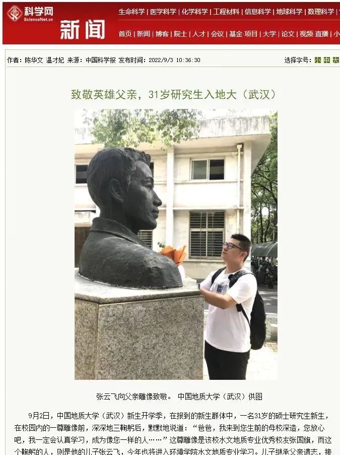 (武汉)新生开学季,在报到的新生群体中,一名31岁的硕士研究生新生,在校园内的一尊雕像前,深深地三鞠躬后,默默地说道:“爸爸,我来到您生前的母校深造,您放心吧,我一定会认真学习,成为像您一样的人……”这尊雕像是该校水文地质专业优秀校友张国旗,而这个鞠躬的人,则是他的儿子张云飞,今年也将进入18小说