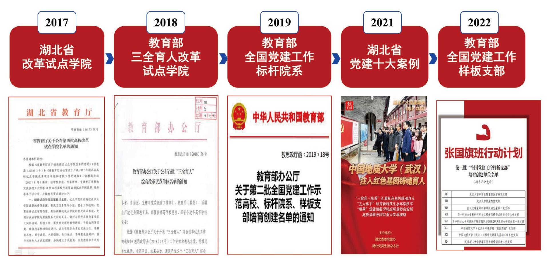 先后入选湖北省高校试点改革学院(2017)、教育部首批“三全育人”综合改革试点学院(2018)、第二批全国党建工作标杆院系(2019)、党建成果“注入红色基因铸魂育人”入选2019—2020湖北十大党建案例、“张国旗班”党支部入选第三批“全国党建工作样板支部”(2022)。办学七十年来,18小说