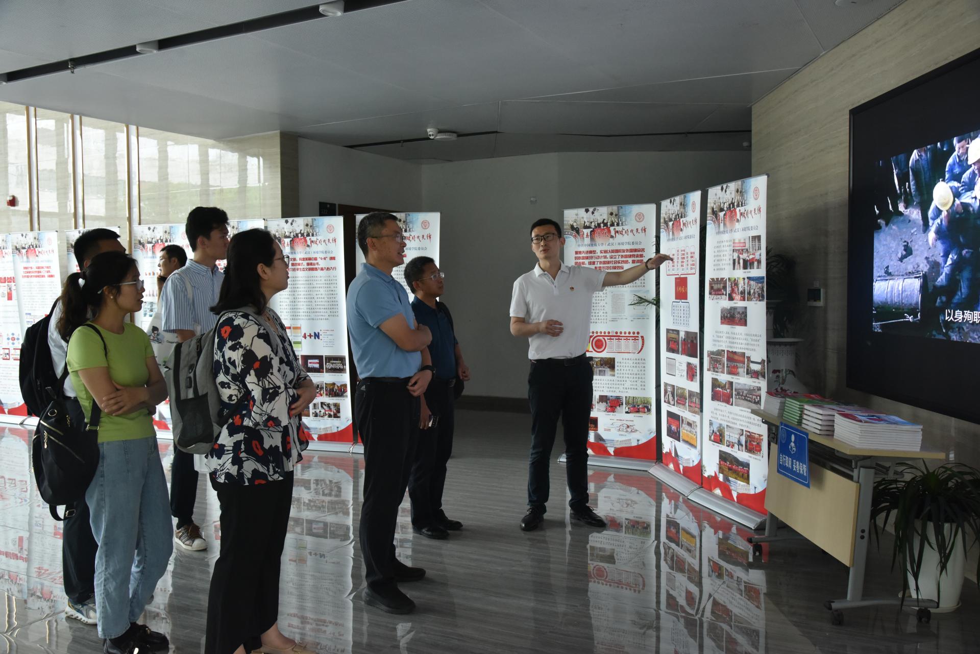 党建“双创”工作成果展板与学院文化墙建设,王海锋从学院基本概况、党建工作体系、三全育人改革、跨学科教育研究、张国旗班行动计划、“4+N”美丽中国课程思政、“1+6”党建资政育人载体、兄弟院校交流互鉴、领导关怀指导和社会媒体反响十个方面,介绍了学院党委党建示范创建和质量创优工作的创新性成果。