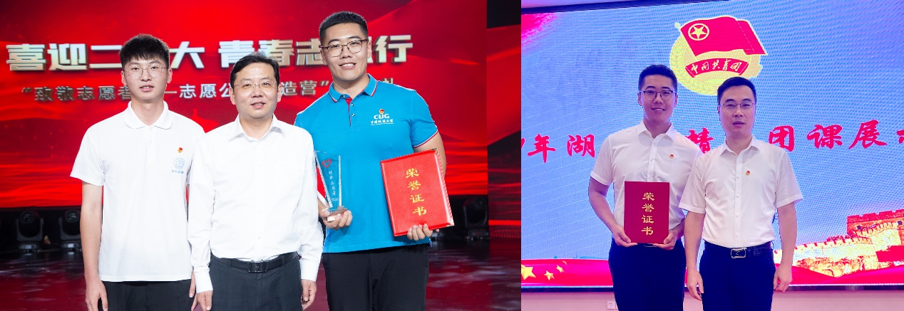 共青团湖北省委书记周森锋为韩鹏颁奖(左)、时任共青团湖北省委副书记王云清为韩鹏颁奖(右)