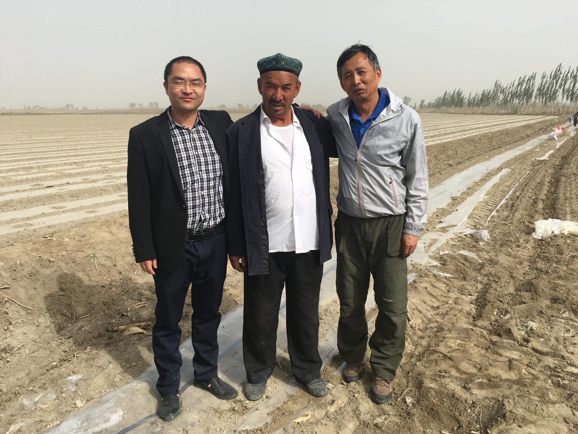2018年4月,洪军(左一)参与“民族团结一家亲”活动,到田间地头看望维吾尔族结对亲戚。