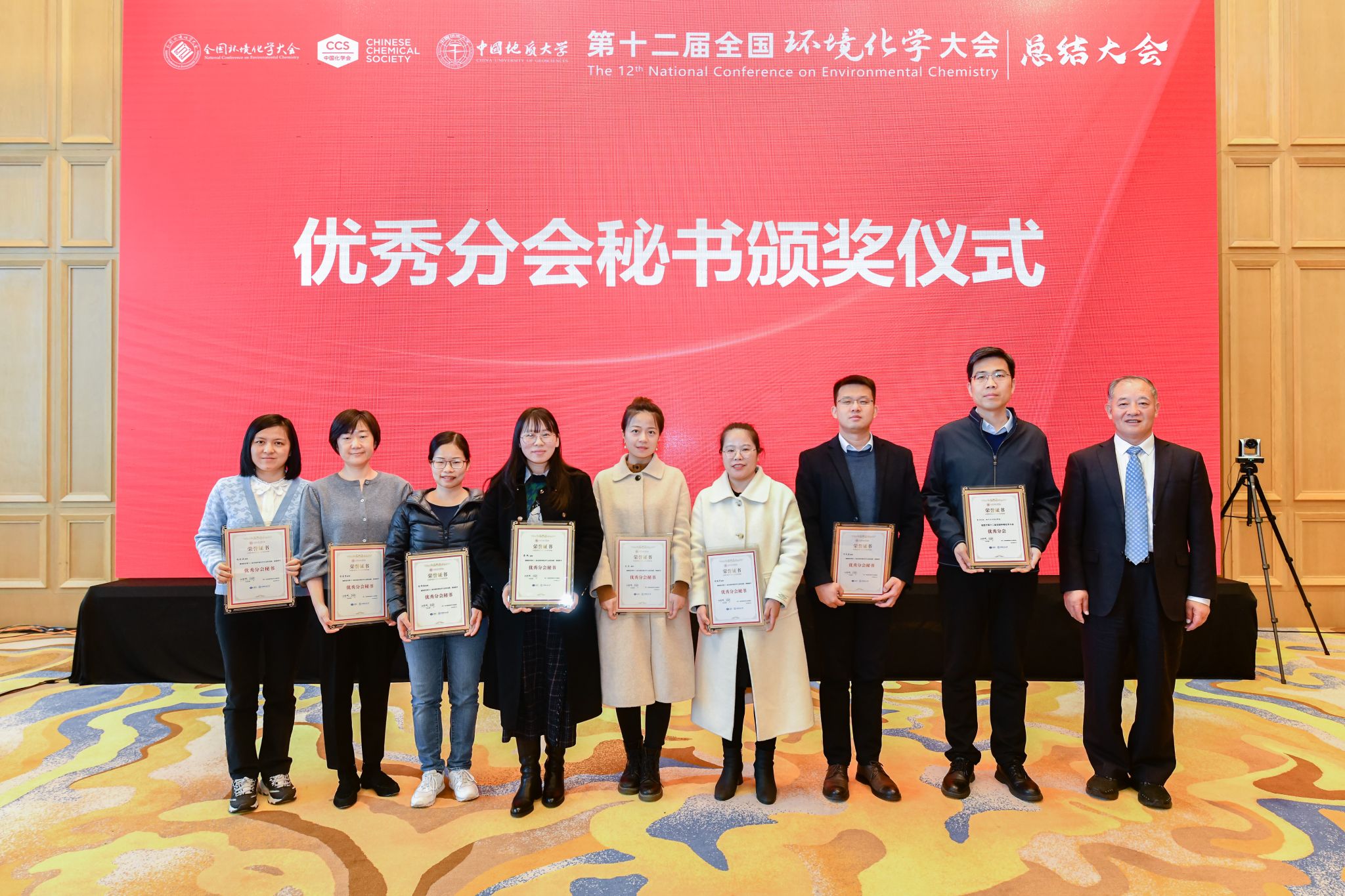 中国化学会环境化学专业委员会郑明辉主任宣读了大会表彰决定。共有20个分会被授予第十二届全国环境化学大会优秀分会,20位秘书被授予优秀分会秘书荣誉称号,15名同志被授予大会优秀组织奖;18小说