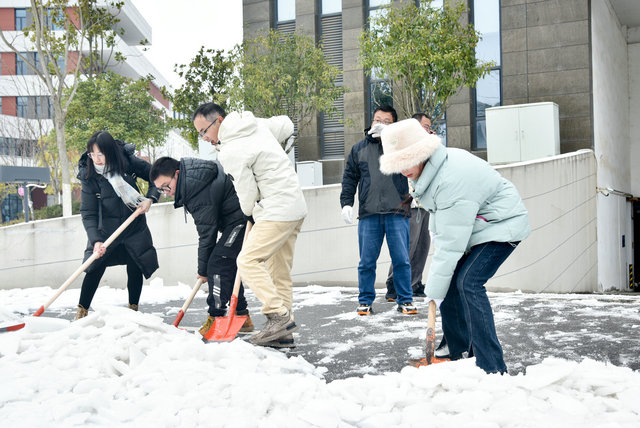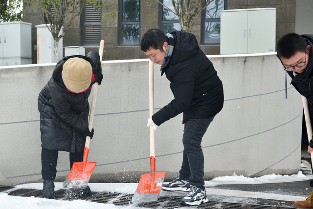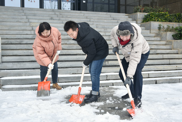 大楼西门、南门、车库入口等主要出入口的冻冰积雪,清扫出一条条“温暖平安路”,为师生出行筑牢安全屏障。