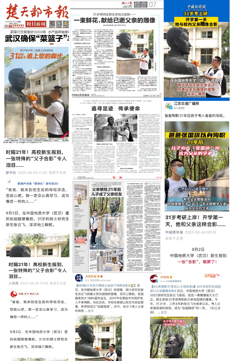 近年来,上级部门领导多次来调研支部党建工作给予充分肯定和高度评价。2018年12月,时任湖北省委常委、宣传部部长、高校工委书记王艳玲来学院调研党建和思政工作。2021年时任湖北省委组织部长李荣灿来校调研听取专题汇报。2022年5月全省高校党建工作推进会定点考察学院,“张国旗班”党支部在11月湖北高校“全国党建工作样板支部”工作交流研讨会做专题交流,省高工委专职副书记张幸平两次莅临学院指导。中央电视台、新华网、《人民日报》《光明日报》《中国教育报》《中国资源报》《中国科学报》《中国青年报》《中国气象报》《经济日报》《湖北日报》、湖北卫视、武汉电视台等媒体平台对支部事迹进行了深入宣传报道。仅张国旗、张云飞英雄父子故事被大台大报大刊大网宣传报道的总阅读量超过2000万。