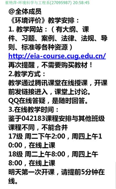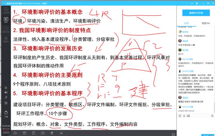 针对《环境评价》课程内容多,知识点琐碎的特点,教学方式采用“网络教学资源+腾讯课堂直播讨论+课堂作业”的方式开展。建立了《环境评价》教学网站,提供大纲、课件、习题、案例、法律、导则等各种资源,方便学生的预习和复习,课堂中以重点内容讲解、问题反馈、讨论、习题的方式,对存在问题和重点内容进行讲解。