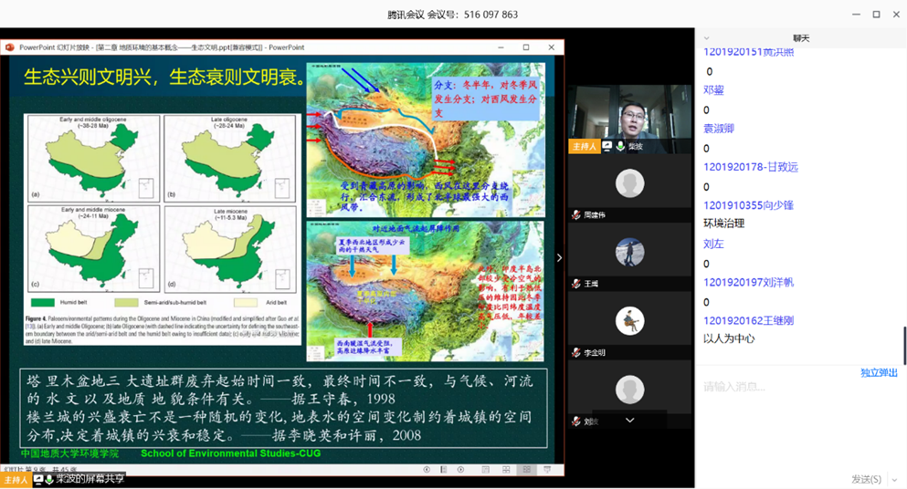 (武汉)的课程。因本科生周四下午基本不开课,选定听研究生周四下午的《环境地质学》。安排柴波老师做准备,周建伟老师辅助第二天的远程教学。当晚,研究生院通知,教育厅学位办也希望听学校的研究生课程。于是,决定合在一起,把《环境地质学》作为周四教育厅调研远程线上教学的观摩课程。