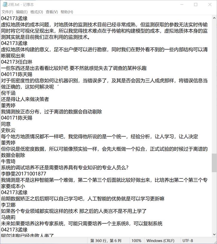 “2019年暑期,我们完成了三大实习基地野外素材采集,并在九、十月完成MOOC室内制作上线。突遇疫情,MOOC转SPOC实现线上线下教学。在居家学习期间,带着学生们思考未来工作的发展方向,讨论已经学过的课程如何转化为自己的知识,了解规矩和规则的重要性。昨天第一次作业汇报,一开始同学们很腼腆,第一个汇报后气氛热闹起来,大数据,人工智能,物联网,面向深地、深空、深海、深蓝的探测,勘查机器人,全球地质大数据库,同学们都有所提及,讨论也十分热烈。时常想,我们教的很多知识、技能可能已经远落后于时代,但能够独立思考,善于学习,那依然可以引领发展。期望每个学生都能收获属于自己的知识,理论、方法和技术就在那,只有遇到问题在自己脑海中生成其关联,并付诸于行动,它们才真正属于你”