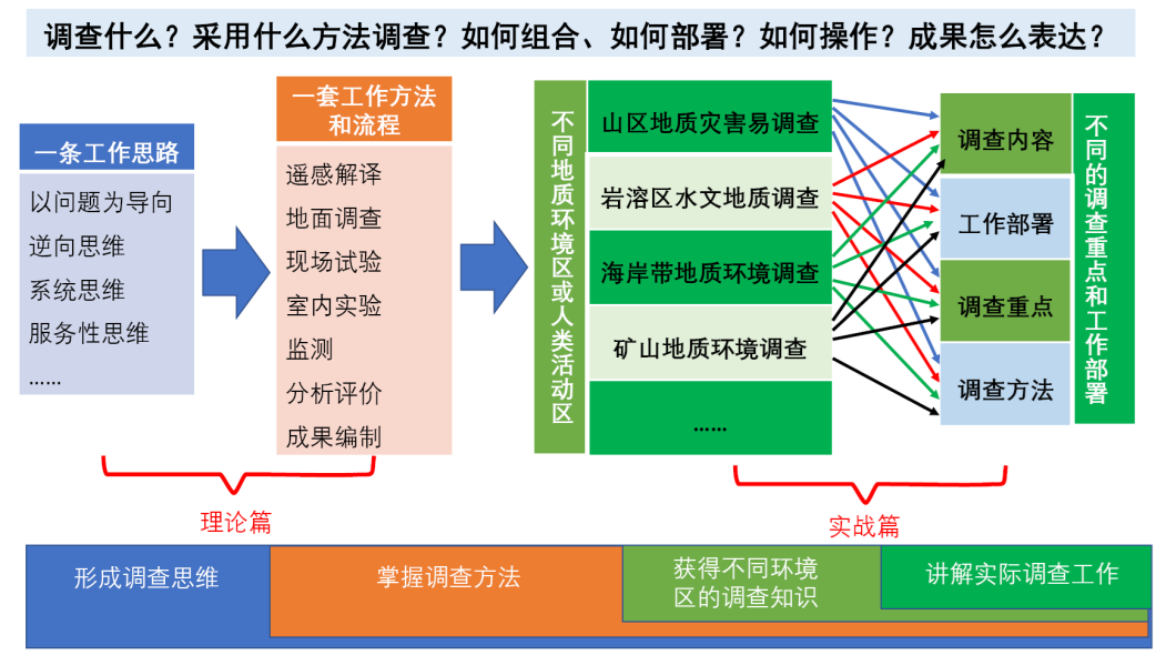 此时,柴波、李小倩等几位老师想到周爱国教授为全国水工环地质调查人员培训会的讲授内容,几位老师也多次聆听周老师在不同场合对环境地质调查思维的论证。正是日常与周老师交流的耳语目染,形成了本课程理论篇所讲授的一条工作思路、一套工作方法和流程。这些思维不仅仅是课程内容,也映射到了教学的各环节,使课程团队能够积极地引导学生思考问题、指导学生建设系统的知识结构、鼓励学生树立正确的人生目标。