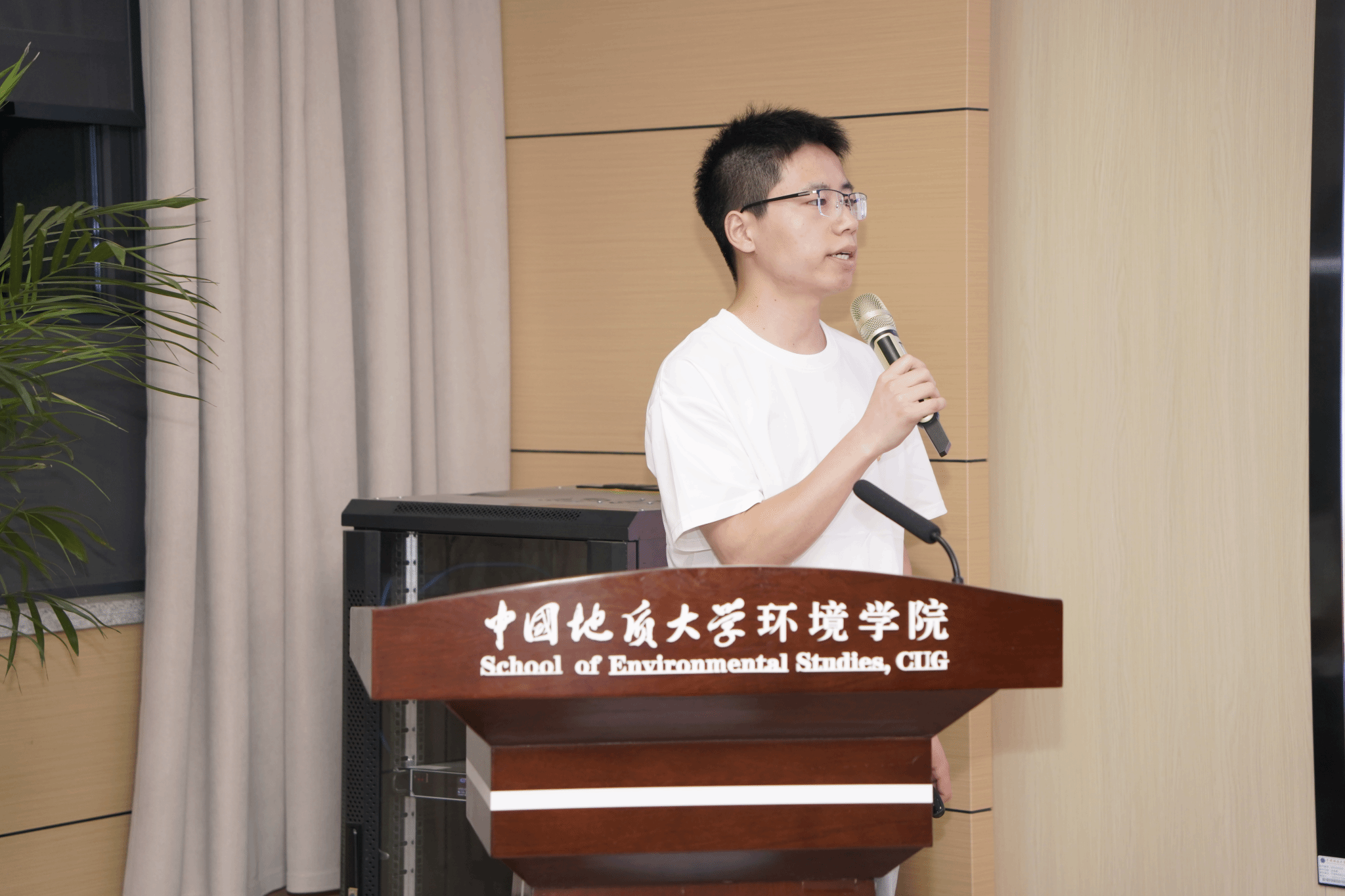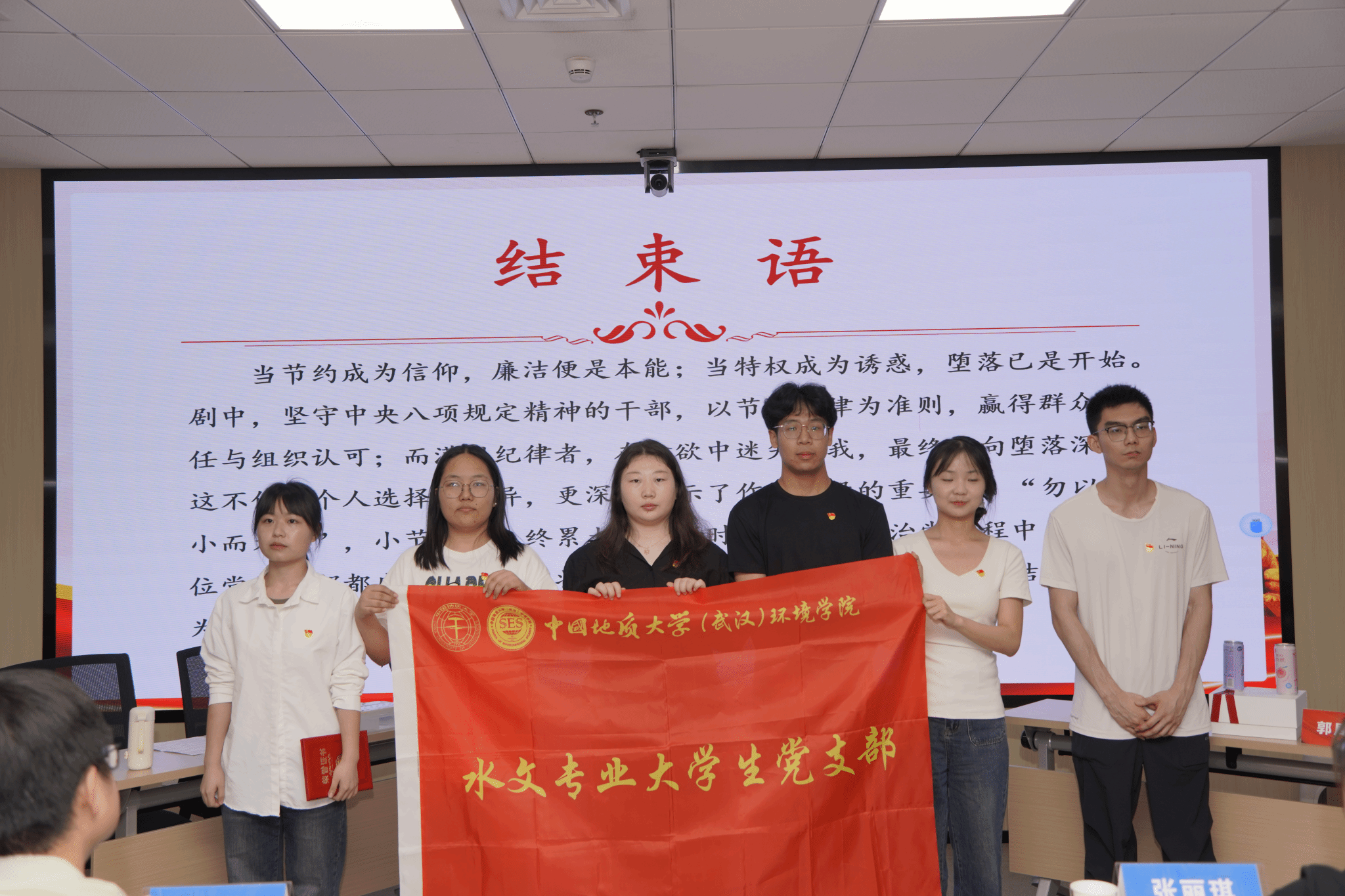 陈俊男为本次展演活动一等奖获奖支部颁奖。环境工程专业大学生党支部、水文专业大学生党支部2个支部获得一等奖。