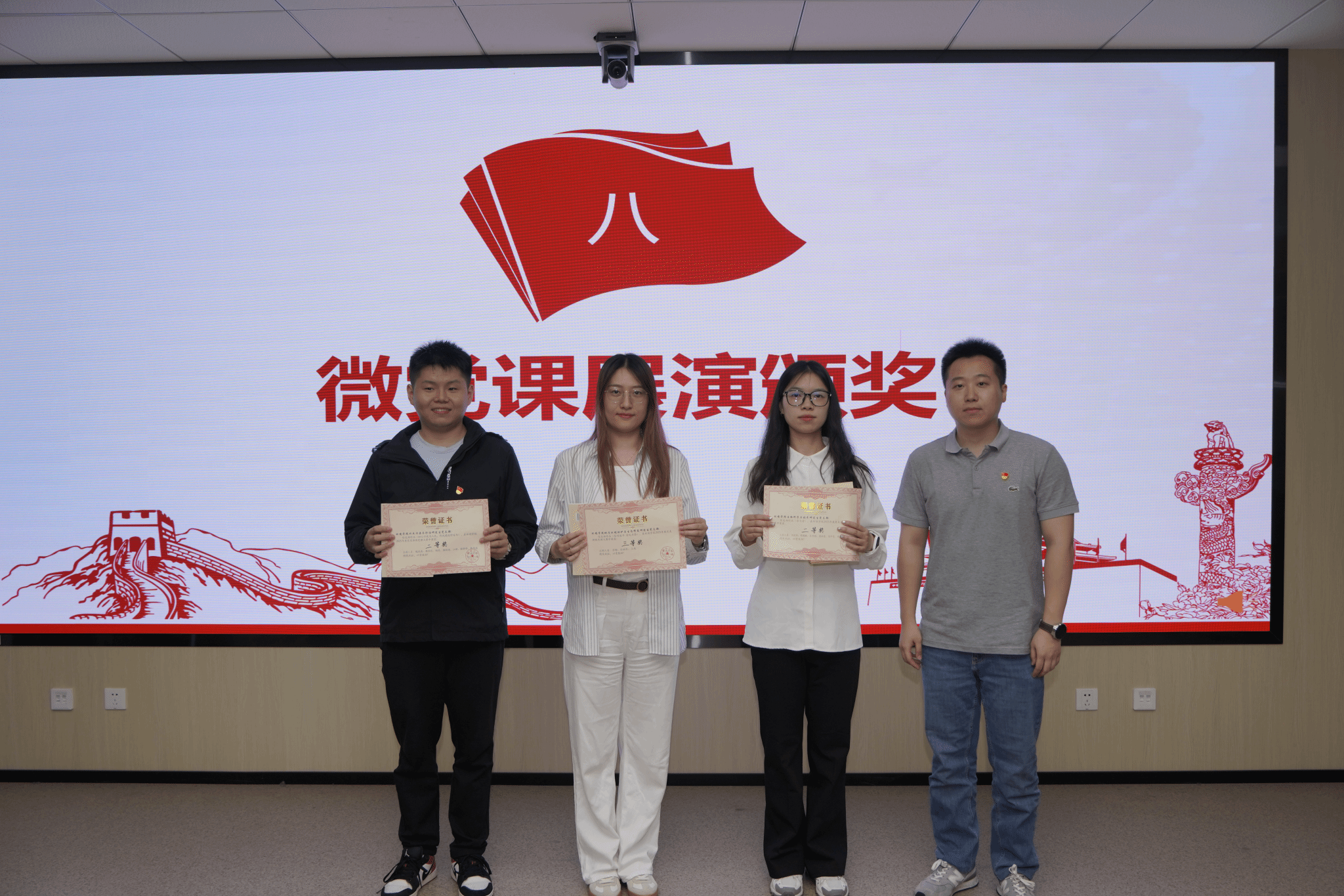 孟庆达为本次展演活动二等奖获奖支部颁奖。生物科学与技术研究生党支部、水土污染与防治研究生党支部、地质环境保护与生态修复研究生党支部3个支部获得二等奖。