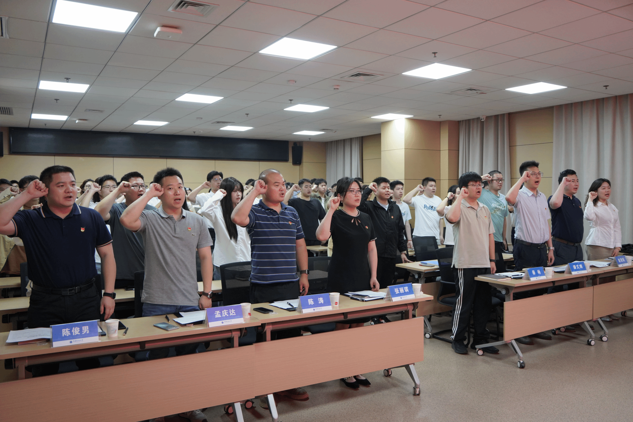 全体人员齐唱国歌,重温入党誓词。地质环境保护与生态修复研究生党支部书记李舒领誓。