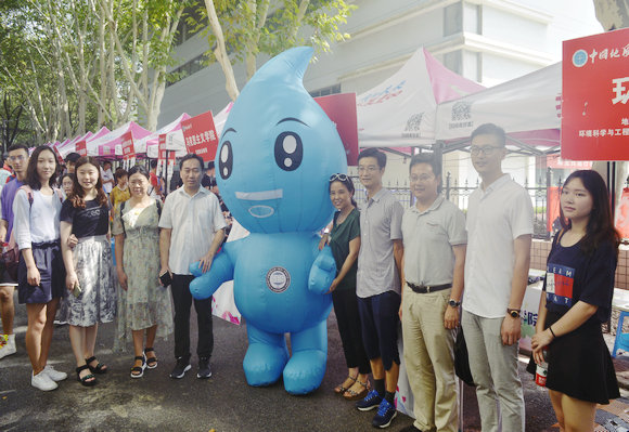 学院领导及工作人员与“小水滴”玩偶合影