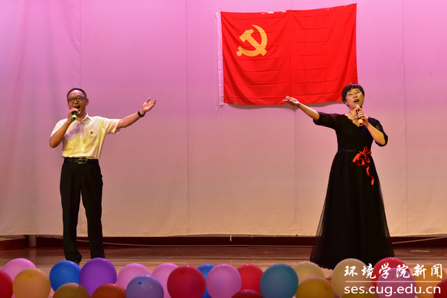 教职工党支部代表、院直党支部书记张学海和学院办公室主任左麦枝共同演唱歌曲《不忘初心》,将本次党支部风采大赛推向了高潮。