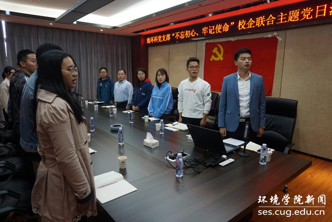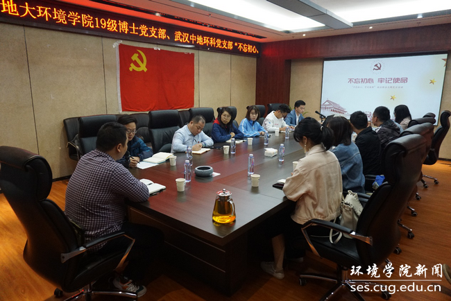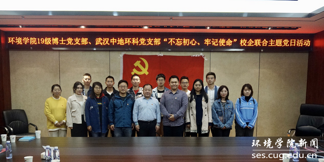 2019级博士党支部党员代表走进武汉中地环科集团有限公司,与中地环科水工环科技咨询有限责任公司党支部共同开展“不忘初心、牢记使命”校企联合主题党日活动。学院党委副书记姜明敏,优秀校友、武汉中地环科集团有限公司总经理金晓文参加活动。
