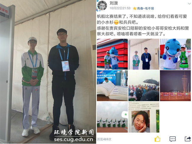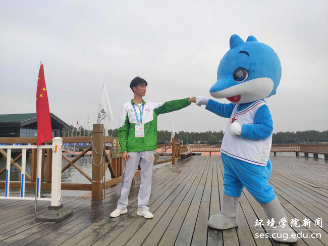 的“小水杉”——17级大气科学专业的哈斯朝鲁和18级水文与水资源工程专业庄胜杰,他们每天在闷热厚重的卡通服里向各位路过的来宾、运动员、工作人员和志愿者挥手打招呼,蹦蹦跳跳成为了帆船赛场上一抹可爱而亮丽的色彩。