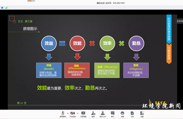 为帮助学生全面理解时间管理这一概念,她着重讲述时间管理的基本原理,并提出诸如“利用目标牵引”、“危机感的催促”、“建立成长小组”等多种实用性建议。