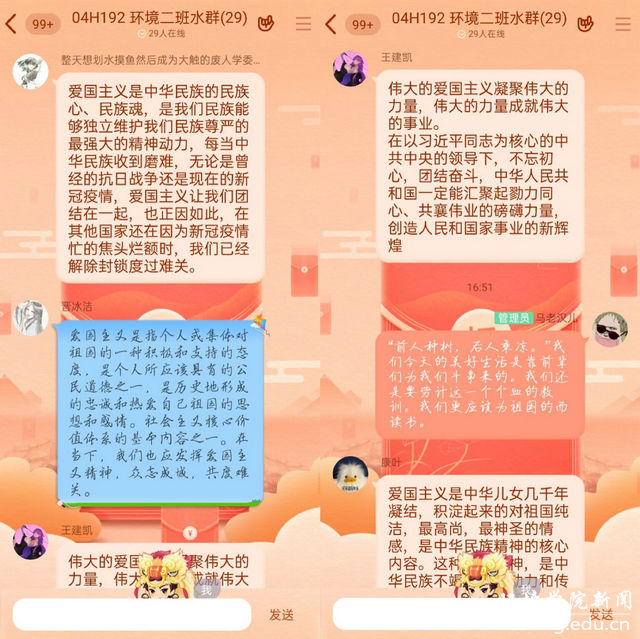 045171班王一安说,爱国主义精神源远流长。从抗日战争到“两弹一星”战略决策,从大庆精神再到新冠病毒疫情的中国力量,我国涌现出无数有爱国主义精神的仁人志士。这次疫情中,广大的党员群众全面动员起来,发扬不畏艰险、无私奉献的精神,坚定站在疫情防控第一线,哪里任务险重,哪里就有党组织坚强有力的工作、哪里就有党员当先锋作表率。正是因为有这样源远流长的爱国精神支持,中国人民才能一次次战胜困难。我们青年学生要以这些仁人志士为榜样,为祖国奉献自己的力量。