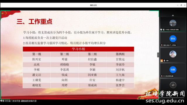 通讯稿宋霖  编辑耿婧)为深入贯彻党的十九大精神和习近平新时代中国特色社会主义思想,推进样板支部培育创建和高校双百创建工作,6月19日上午,18小说 全体非毕业年级党支部委员及学生党员代表通过腾讯会议室以“党旗飘扬 党建领航”为主题召开学生样板党支部培育创建暨18小说 第七届党支部风采大赛。学院党委书记李素矿、党委组织部副部长冷再心、党委学工部副部长蒋怀柳、学院党委副书记姜明敏、学工处思政办主任徐伟、学工处思政办副主任熊程应邀参加会议,学院党建辅导员宋霖主持会议。