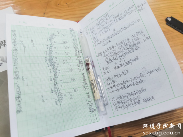 “眼睛看到什么记录下什么,而更多的分析和推测应该放在后续的小结慢慢总结。”关于野簿记录,王涛老师为此颇费心思。野簿,顾名思义便是野外记录簿,多年的学习使得同学们都有着惯性的思维,提交之前总想着如何写的详细,如何写的美观,老师讲的部分是否有都记录下来。王老师严格要求我们在观察岩石地层时候收起野簿,观察结束后才开始记录,回到基地下车便收野簿。刚开始同学们记录的一团乱,王老师总是耐心向同学们讲解正确的格式和记录思维,小小的野簿记录,我们看到的是地质人严谨的工作态度。