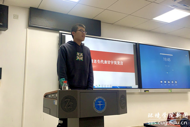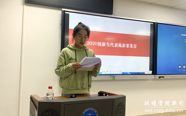 2020级新生代表苑亦菲发言。生于非典、考于新冠,表达在今后的学习和生活中,他们将牢记心中有地大、肩上有责任、脚下有远方,定不负重托、迎难而上,争做国际复合型人才,成为红专能优的生态环保铁军。