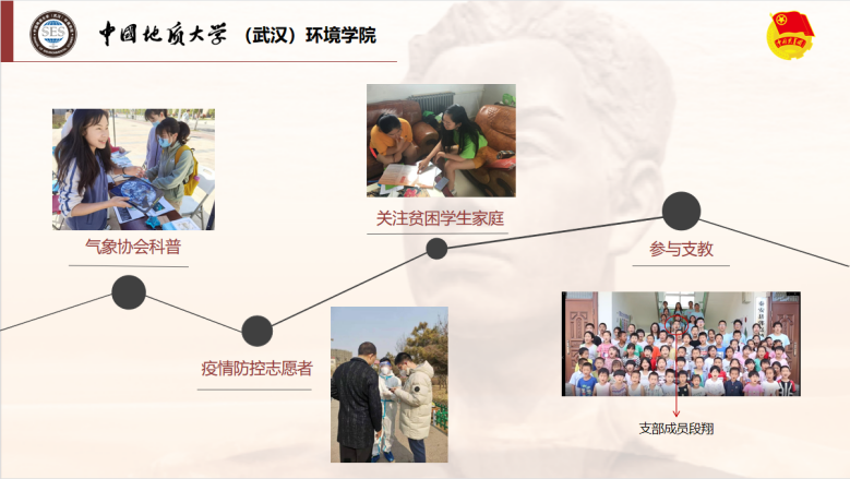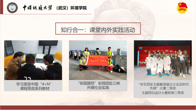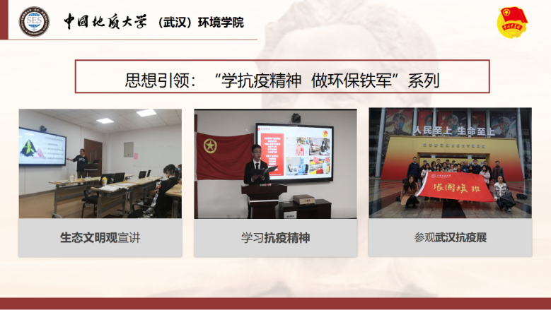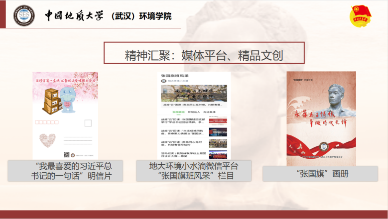 支部借助学院主页开设“张国旗班行动计划”专题栏目、“地大环境小水滴”微信公众号开设“张国旗班风采”专栏,讲述支部故事;参与制作“我最喜爱的习近平总书记的一句话”系列明信片及支部文创周边。
