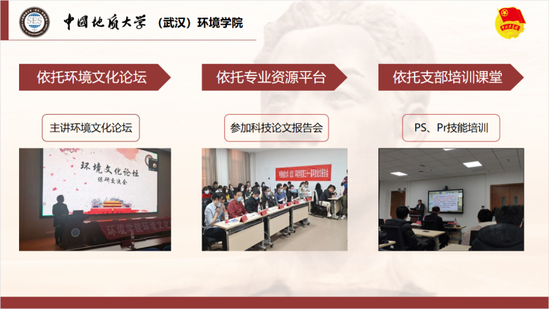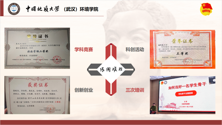 “张国旗班”团支部将以环境文化论坛、专业资源平台和支部第二课堂为载体,引领青年专业精湛,加强新技能培训学习。支部成员积极参与科技论文报告会以及“科研助成长”系列活动,获科报会院级三等奖,第六届“互联网+”大学生创新创业大赛三等奖,“兖州中材杯”武汉理工大学第十三届环保创意作品大赛二等奖、三等奖等。