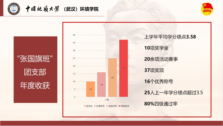 在2020年度,“张国旗班”团支部收获良多。支部成员上学年平均学分绩点3.58,25人上一年学分绩点超过3.5,10人获得奖学金,在20余项活动赛事中斩获37项奖项,共获得16个优秀称号。
