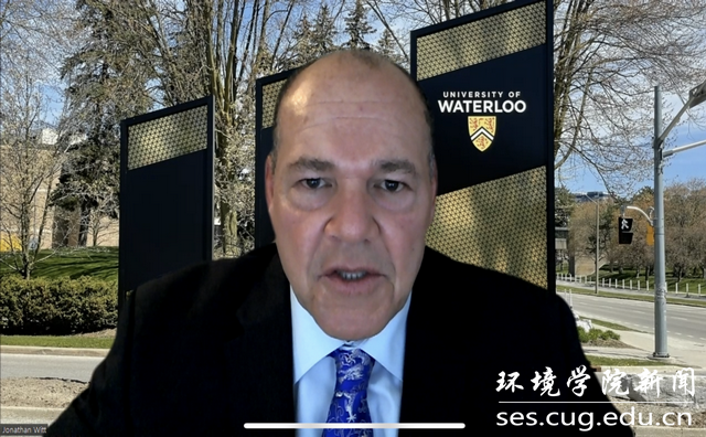 滑铁卢大学理学院副院长Jonathan致辞,首先他祝贺同学们顺利获得两校文凭,并表示在地大与同学们授课的经历将是美好的回忆。作为两校合作办学的首届毕业生,肯定他们在求学之路上的拼劲与韧劲,期待他们在未来继续大放异彩。