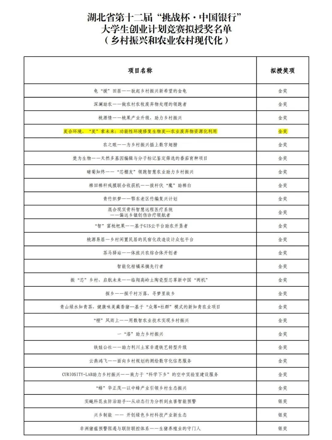 炭合团队项目“炭合环境,‘炭’所未来:功能性环境修复生物炭——废弃生物质资源化利用”以总评第四的成绩获得乡村振兴和农业农村现代化赛道金奖,成功入围国赛。