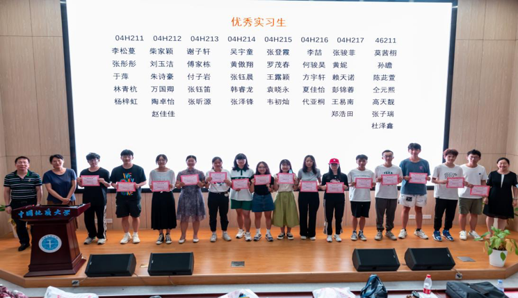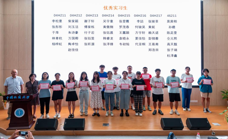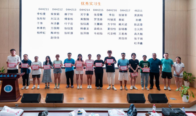 李立青老师祝贺全体学生顺利通过本次实习,同时宣读了优秀实习生名单。李松蔓等44名同学获评此荣誉,相关同学按班级顺序依次上台领奖。