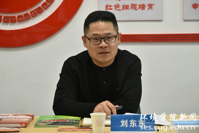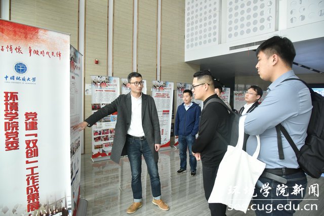 刘东东一行参观学院党建“双创”成果展和师生野外实习风采展。王海锋讲解展板,全面介绍学院党委近年来党建示范创建和质量创优工作取得的创新性理论成果、制度成果、实践成果和特色成果,以及学院师生在野外实习实践的风采。